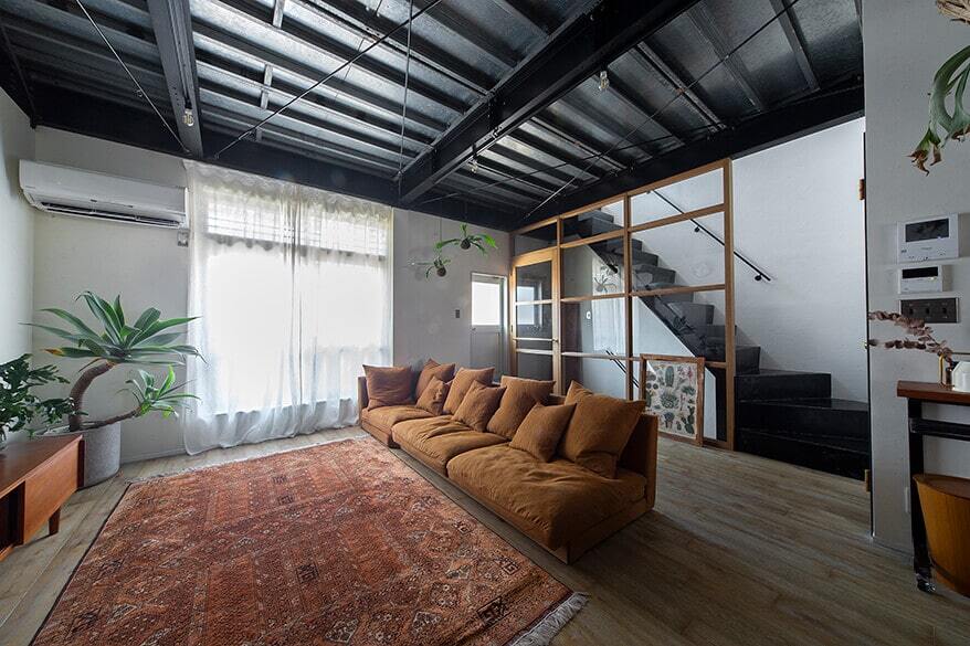 最初は一戸建てを新築する計画もあったそうですが、もっと自由に好みの空間を追求したいとリノベーションを選択し、古い鉄骨造の3階建て住宅を購入。1階の玄関を大胆に広げ、シューズクロークを備えた開放的な土間を設置。2つあった個室は、片方をバッグ作家である奥様の作業場兼ショップ、もう片方を収納としました。2階のLDKは廊下をなくして広さを優先。キッチンを対面式から壁付けに変更したのも空間を有効に活用するためで、洗面スペースやトイレへの動線も以前よりシンプルになりました。3階は2部屋から3部屋に変更。廊下を広めに計画し、壁に洋服が収納できる棚を作れるようにしています。柱や梁、筋交いに階段、現しにした鉄骨の構造がM様邸一番の魅力。ブラシ加工を施したオーク材の無垢フローリングやガラス面を大きく取った木枠のパーテーション、真鍮のパーツをあしらったモールディングドアなど、木の造作がしっとりと馴染み、M様ご自身でDIYされた玄関や作業場、3階の廊下のオープンラックもしっくり。