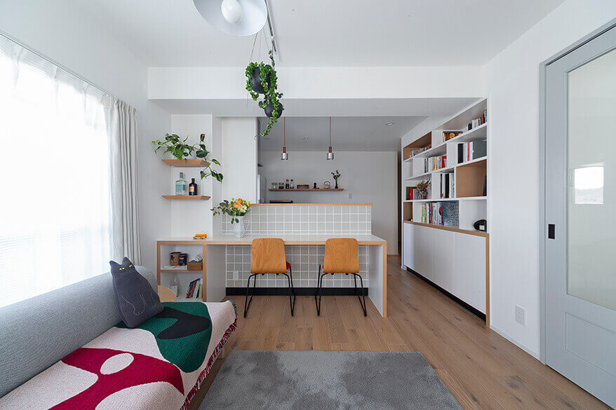 青色がお好きなS様、ご来店時のイメージ相談でもブルーカラーの事例写真が目立ち、ブルーと木をテーマにしたお家造りがスタート。空間のポイントは斜めになっている壁とリビングの一角に造った寝室を兼ねた小上がりスペース。小上がりと同じ高さで仕上げた造作のテレビ台が空間に広がりを持たせてくれます。この小上がり部分、下部は収納になっており、物が多くごちゃごちゃっとしてしまうことがお悩みのS様の救世主に!!手前にはよく使うもの、奥には季節ものなどと仕舞うものをわけてより使いやすく。キッチンは元々独立していましたが、リノベーション後はオープンのアイランド仕上げにして手元を隠すために立ち上がりをつくり、中にはブルーのタイルを貼付。表立って見えない部分にも好きな色を詰め込んでいきました。